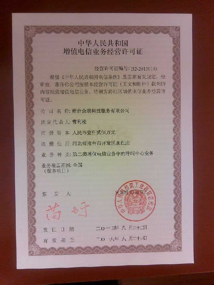 經(jīng)過三個(gè)月的不懈努力,眾聯(lián)科技于2013年8月23日正式取得《中華人民共和國(guó)增值電信業(yè)務(wù)經(jīng)營(yíng)許可證》。