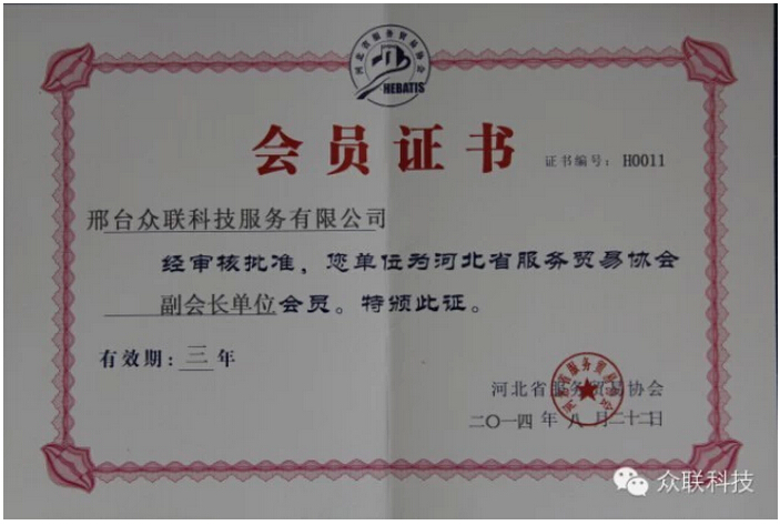 河北省服務(wù)貿(mào)易協(xié)會(huì)在對(duì)邢臺(tái)眾聯(lián)科技服務(wù)有限公司進(jìn)行規(guī)模、信譽(yù)度等各方面情況進(jìn)行嚴(yán)格審查后,認(rèn)定邢臺(tái)眾聯(lián)科技服務(wù)有限公司符合協(xié)會(huì)會(huì)員資格,并頒發(fā)了河北省服務(wù)貿(mào)易協(xié)會(huì)副會(huì)長(zhǎng)單位會(huì)員證書(shū),這標(biāo)志著眾聯(lián)科技在服務(wù)外包行業(yè)邁向了一個(gè)新的臺(tái)階。